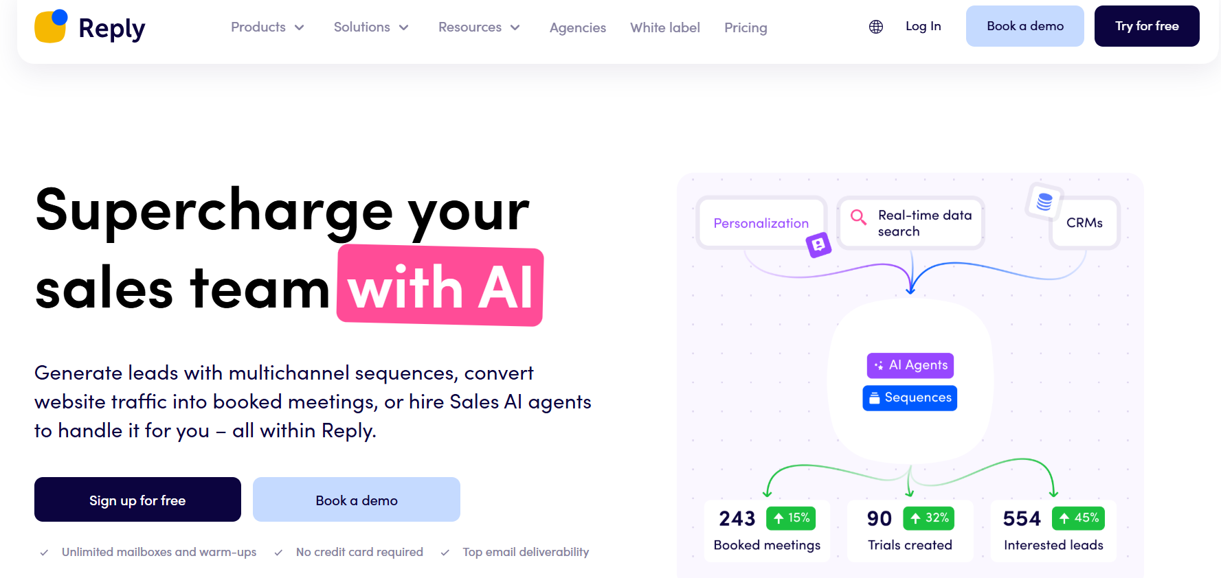 Reply.io combines email, LinkedIn, calls, SMS, and WhatsApp in unified sequences. AI assists with writing, timing, and identifying interested prospects. Jason AI handles conversations and books meetings automatically.