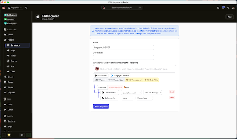 Bento allows you to create precise segments based on subscriber behavior. For example, when creating engagement-based segments, you can use our “engagement score” filter...