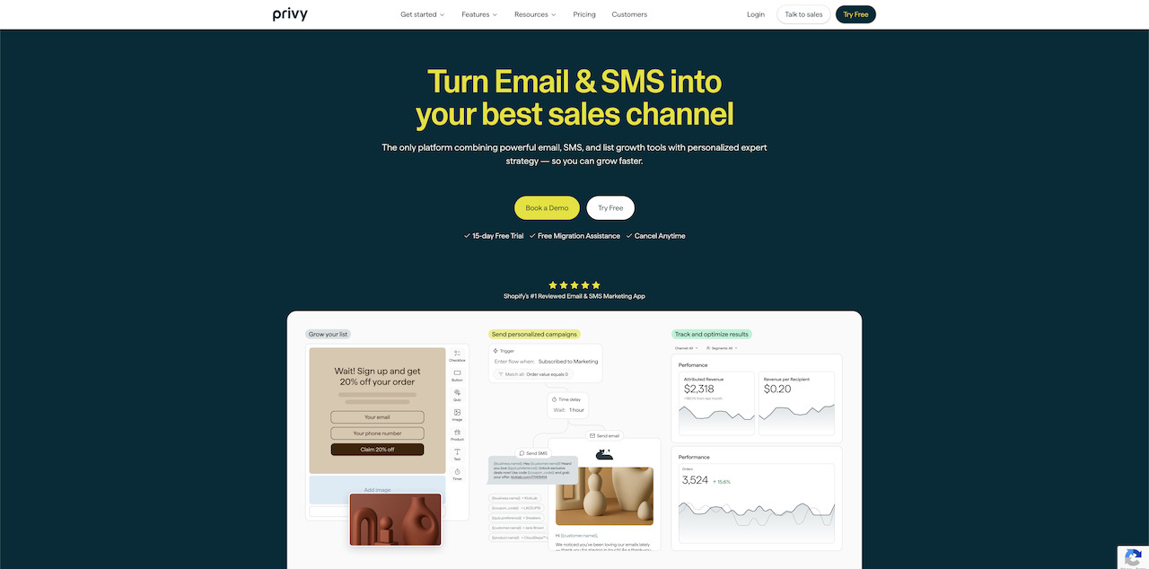 Privy does popups better than email. Powerful popup tools. Exit-intent triggers. Capture forms that convert. Shopify integration makes capturing emails easy at the right moments.