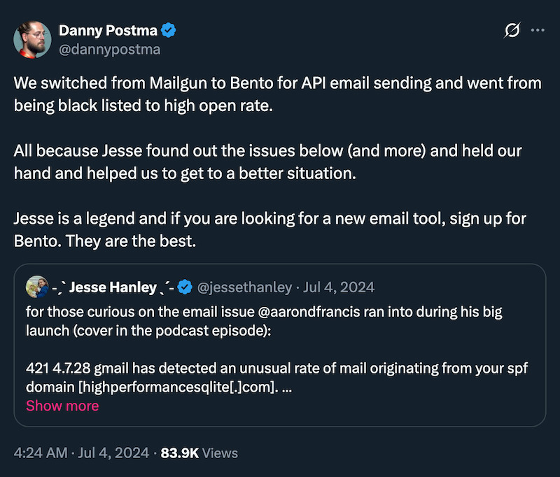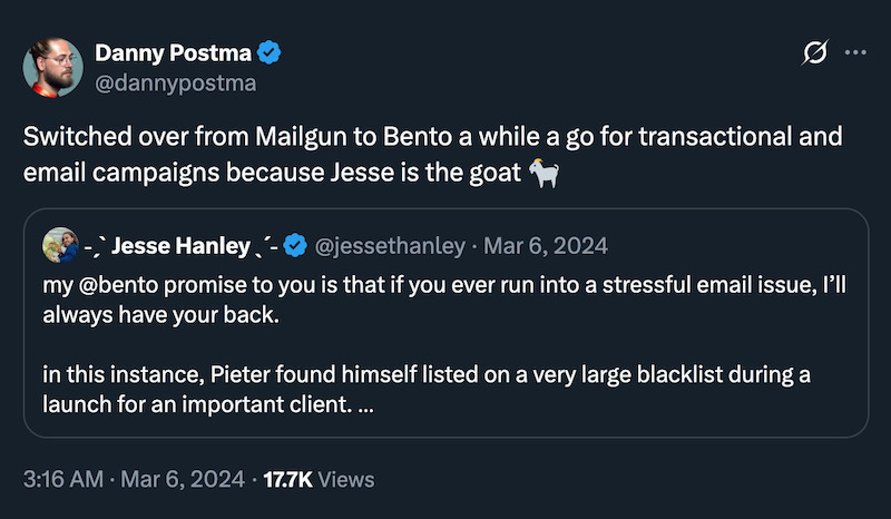 Are you thinking of signing up for or switching to Mailgun? Mailgun promotes itself as being “by developers, for developers.” But many developers switch from Mailgun to Bento. Like Danny Postma, founder of Headshot Pro.